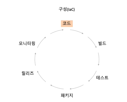 코드 -> 빌드(소스를 컴파일) -> 테스트 -> 패키지(배포전 묶는 작업) -> 릴리즈 -> 모니터링 (로그 파일등..._ )