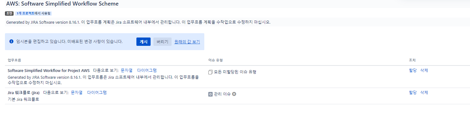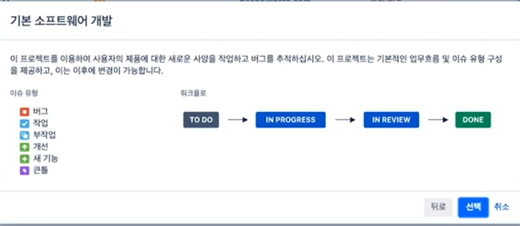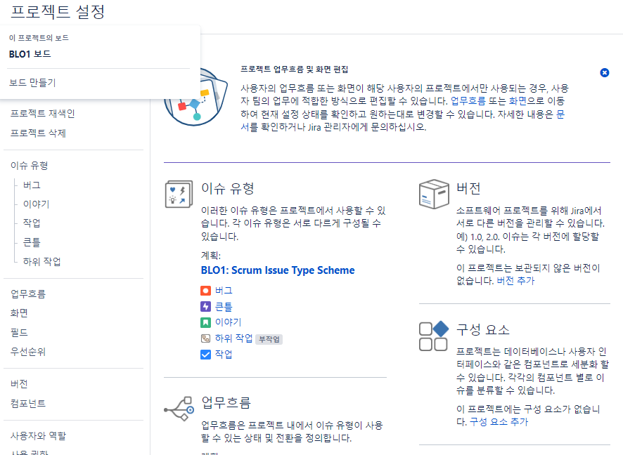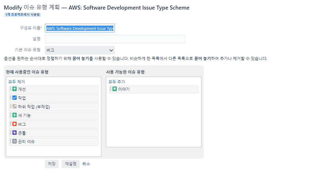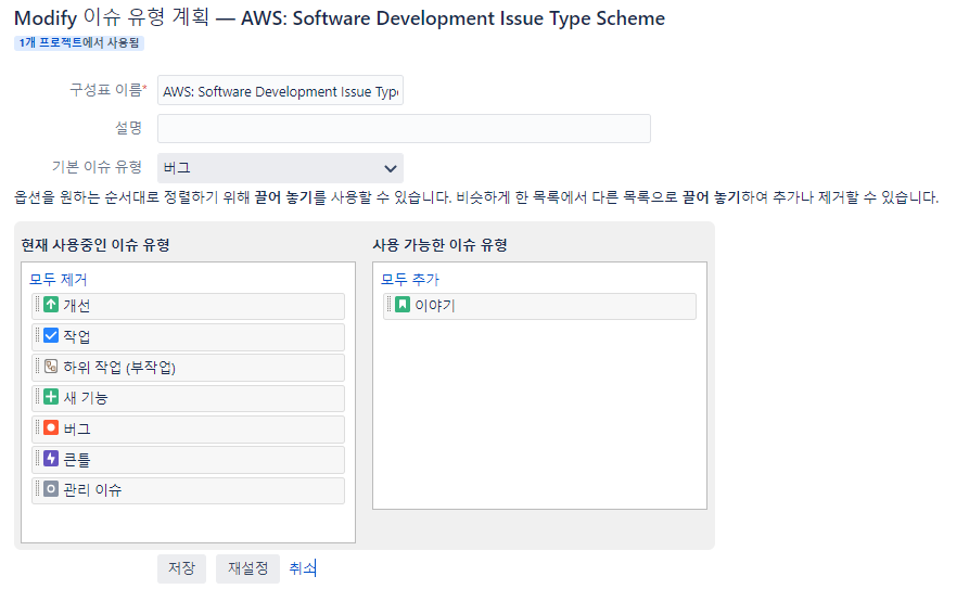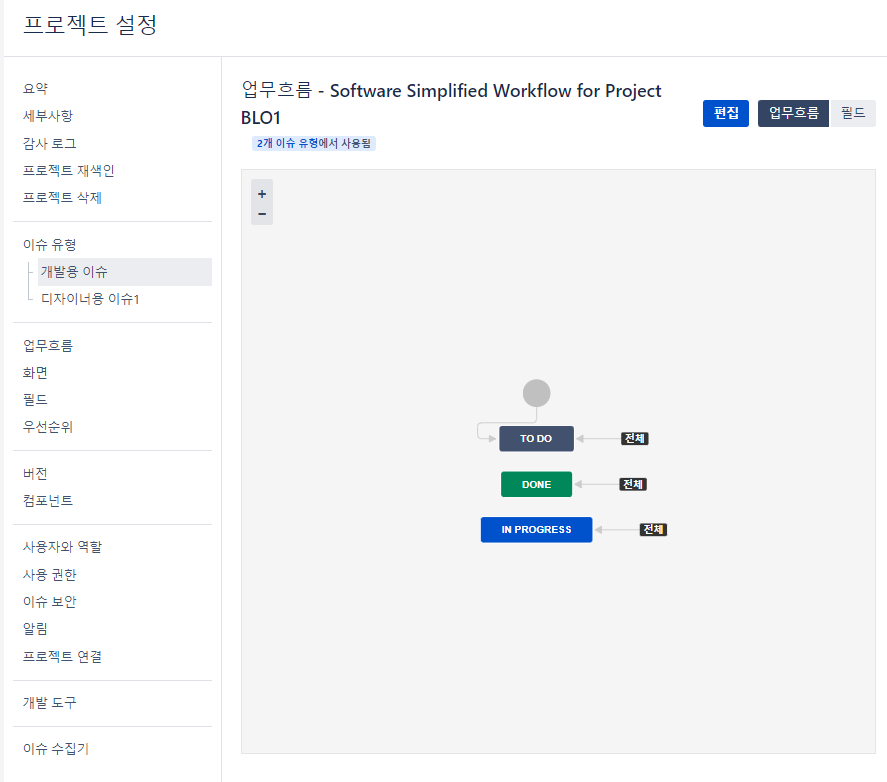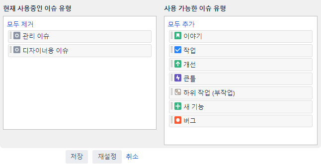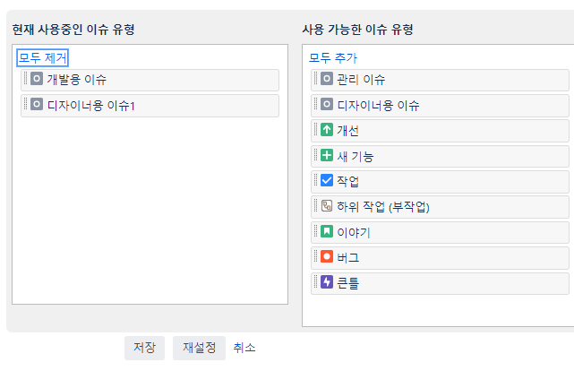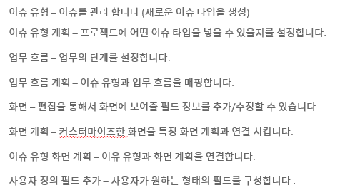 우측 상단 프로젝트 -> 프로젝트 선택->이슈 유형 -> 조치 -> 이슈 유형 수정 -> 이슈 유형 추가