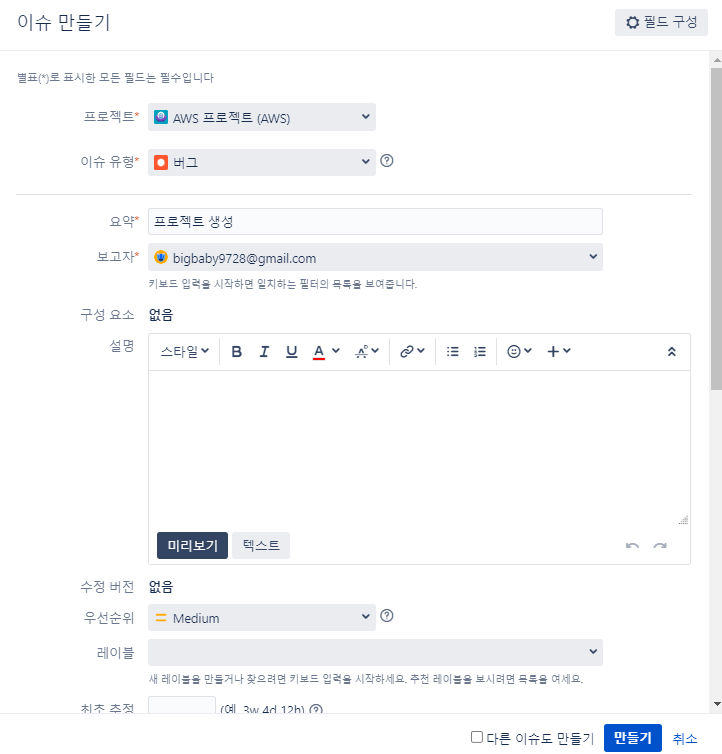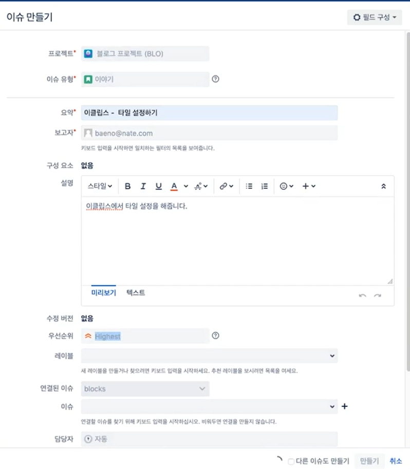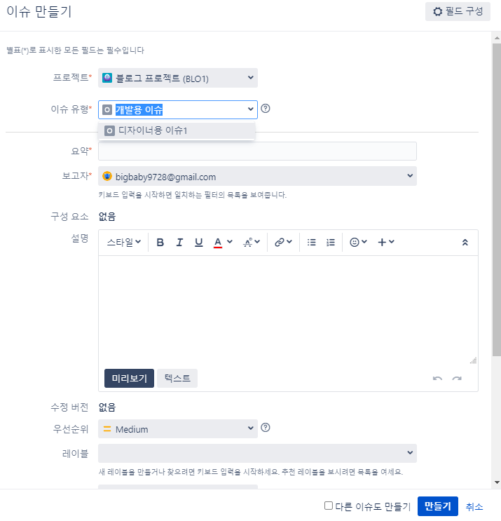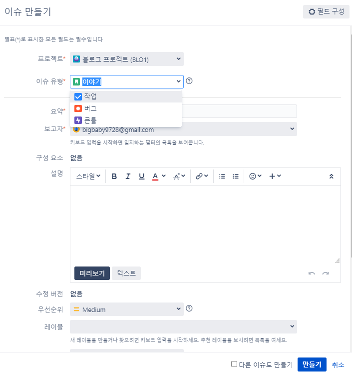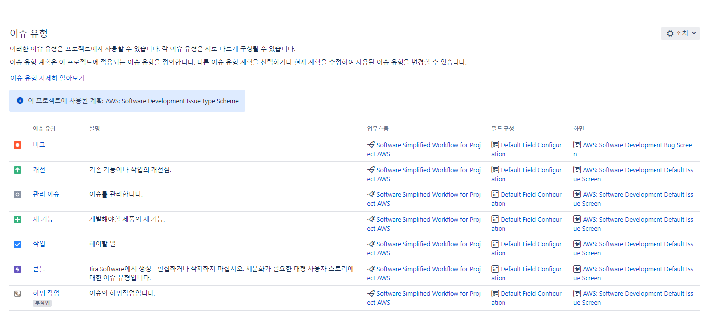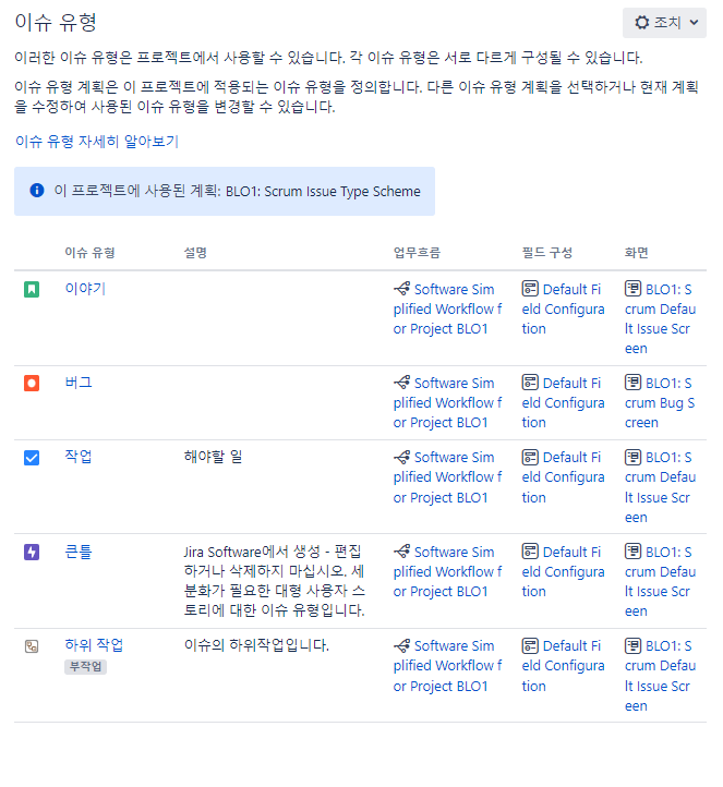 이슈 유형, 우선 순위 등을 설정한다.