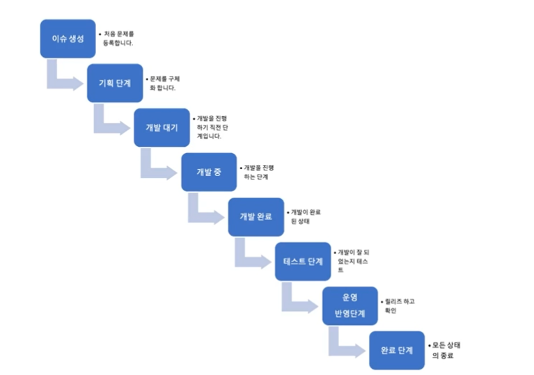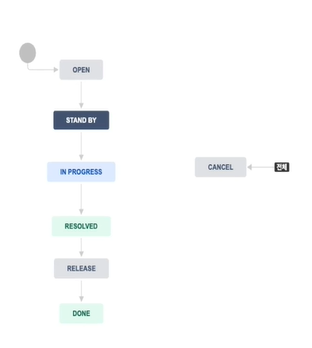 open 개발전, stand by 개발준비 , in progress 개발 중 , resolved 해결, release 반영 , done 완료