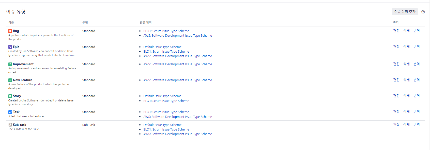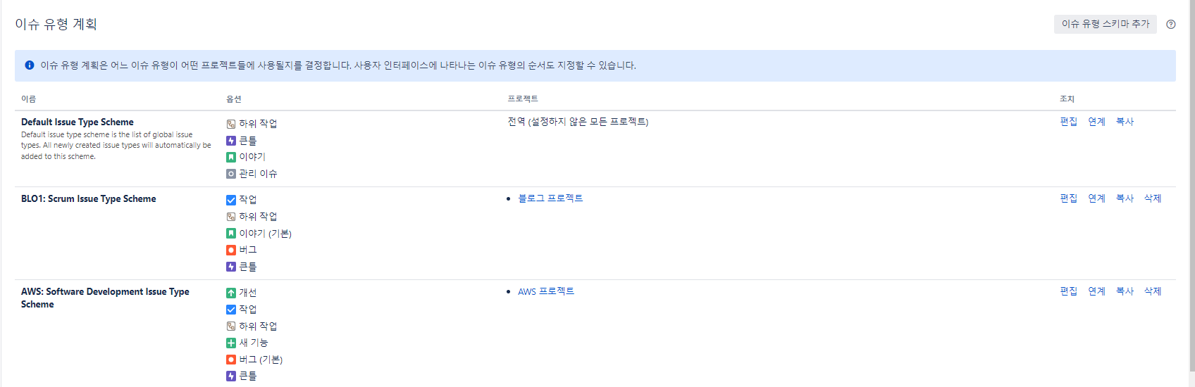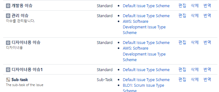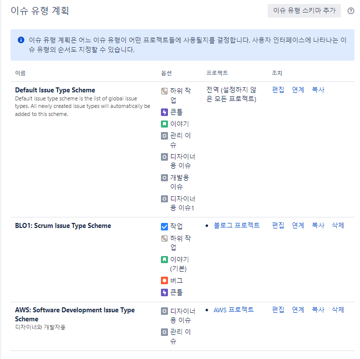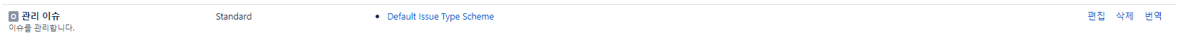 이슈 유형 계획으로 가서 방금 만든 이슈유형을 추가하려면 편집을 누른다.