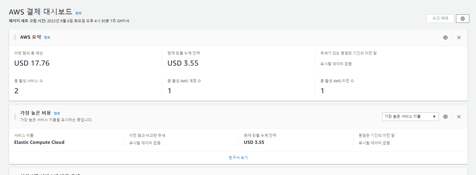 aws 계정 옆에 결제 대시보드를 누르면 과금 정보를 알 수 있다.
