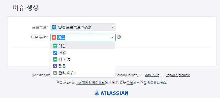 이슈 만들기에 보면 기본 이슈 유형만 있다.