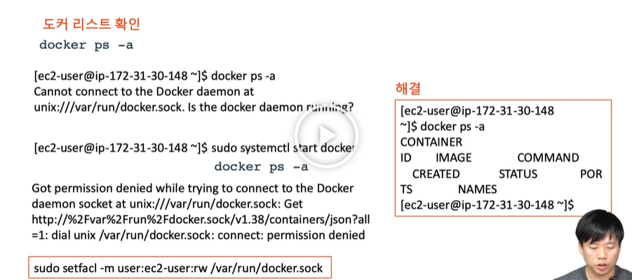 명령들을 하나씩 하니까 리스트 확인이 된다. 도커를 실행하고 권한을 주는것