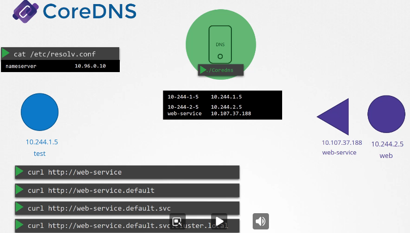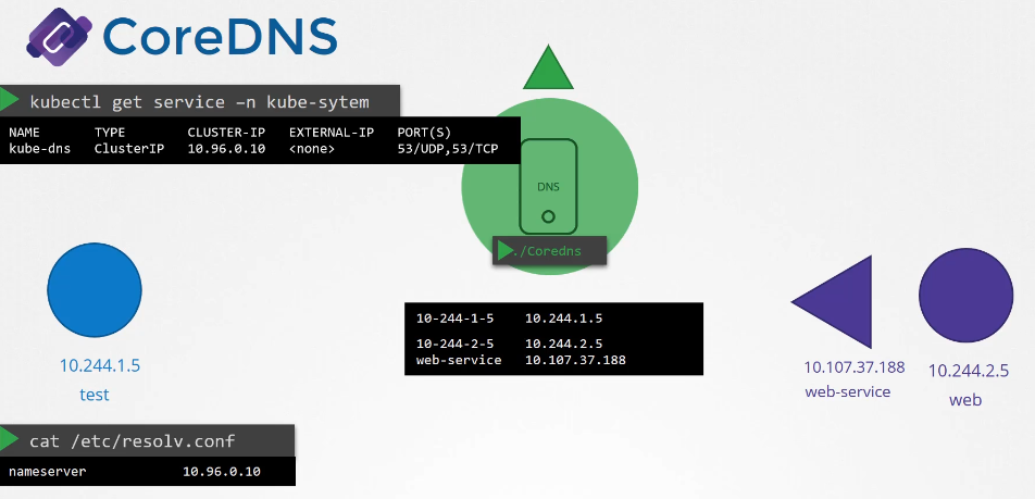 coredns는 kube-dns 라는 서비스와도 연결되어 있어 클러스터내에서 사용가능하다.