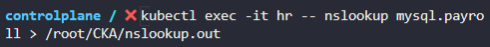kubectl exec -it hr -- nslookup mysql.payroll > /root/CKA/nslookup.out