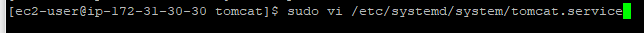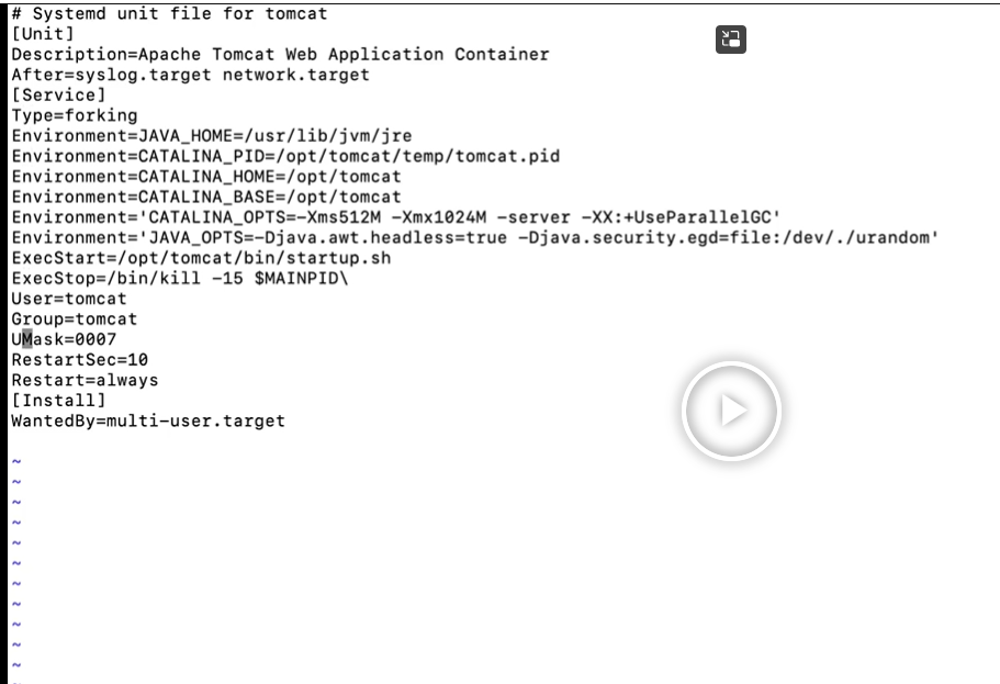 # vi /etc/systemd/system/tomcat.service [Unit] Description=Apache Tomcat Web Application Container After=syslog.target network.target [Service] Type=forking Environment=JAVA_HOME=/usr/lib/jvm/jre Environment=CATALINA_PID=/opt/tomcat/temp/tomcat.pid Environment=CATALINA_HOME=/opt/tomcat Environment=CATALINA_BASE=/opt/tomcat Environment='CATALINA_OPTS=-Xms512M -Xmx1024M -server -XX:+UseParallelGC' Environment='JAVA_OPTS=-Djava.awt.headless=true -Djava.security.egd=file:/dev/./urandom' ExecStart=/opt/tomcat/bin/startup.sh ExecStop=/bin/kill -15 $MAINPID\ User=tomcat Group=tomcat UMask=0007 RestartSec=10 Restart=always [Install] WantedBy=multi-user.target