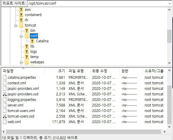 conf 아래 파일에는 web.xml 파일과 server.xml 파일이 존재한다.