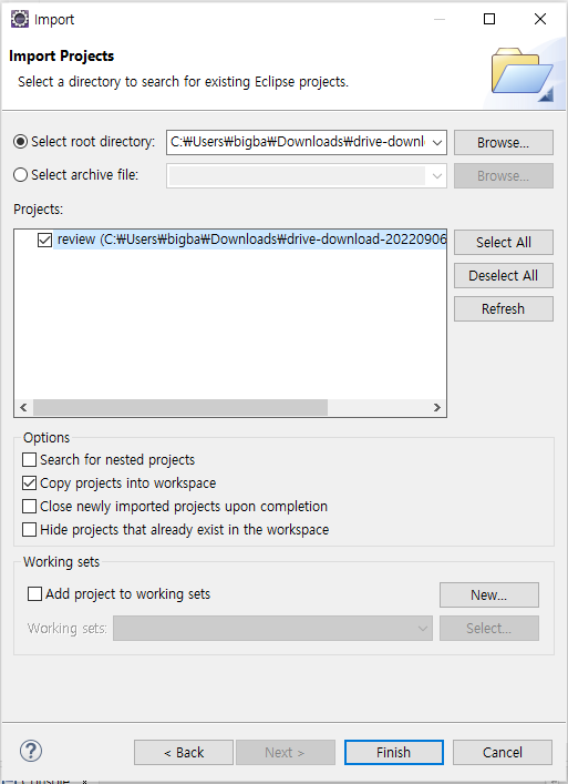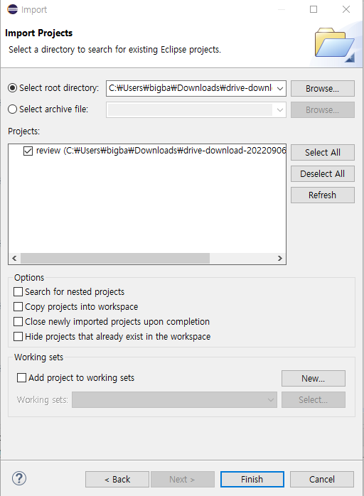 강의에서 제공하는 review 파일을 압축 해제하고 import 한다.