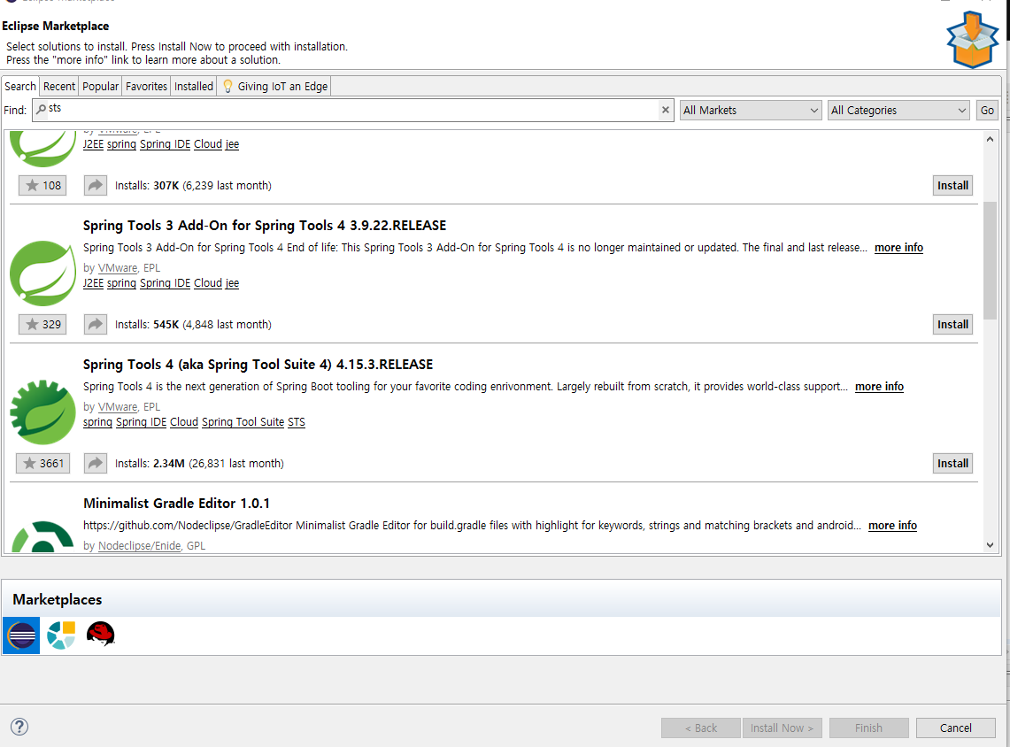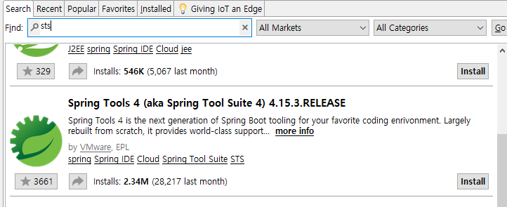 sts를 검색하고 spring tools4 를 다운받는다 .