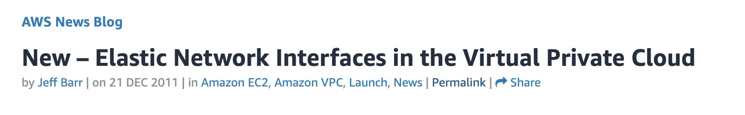 ENI에 대해 더 배우고 싶다면, 이 블로그 글을 읽는 게 도움이 될 거예요. https://aws.amazon.com/blogs/aws/new-elastic-network-interfaces-in-the-virtual-private-cloud/