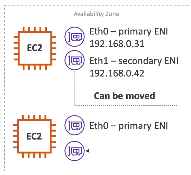탄력적 네트워크 인터페이스(ENIs)는 특정 AZ로 국한됩니다. 다른 AZ에 있는 EC2 인스턴스에 ENI를 연결할 수는 없습니다.