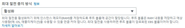 EC2 절전 모드를 활성화하기 위해서는 EC2 인스턴스 루트 볼륨 유형이 EBS 볼륨이어야만 하며, 민감한 내용을 보호할 수 있도록 암호화되어야 합니다.