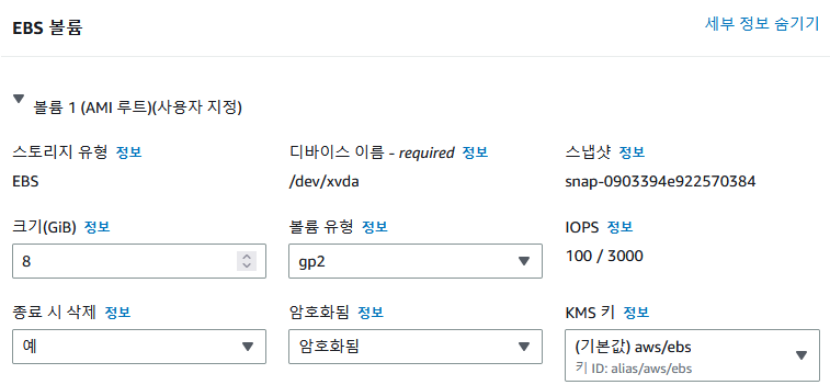 ebs 볼륨의 암호화 옵션과 KMS 옵션을 켠다 . 크기 8GIB 로 충분하다.