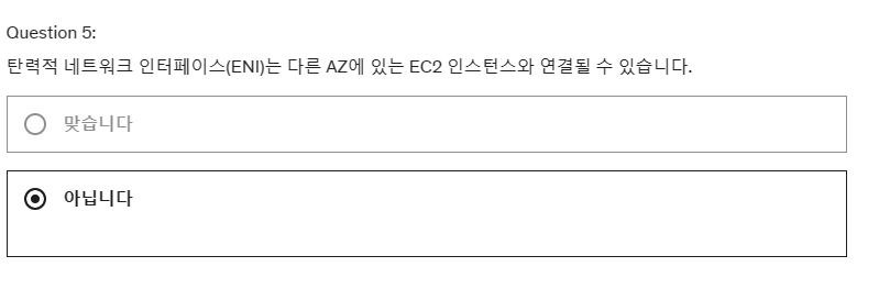 5. 탄력적 네트워크 인터페이스(ENI)는 다른 AZ에 있는 EC2 인스턴스와 연결될 수 있습니다.
