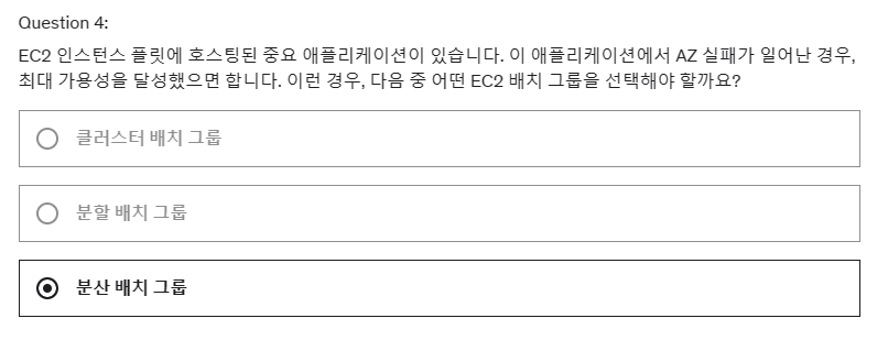 4. EC2 인스턴스 플릿에 호스팅된 중요 애플리케이션이 있습니다. 이 애플리케이션에서 AZ 실패가 일어난 경우, 최대 가용성을 달성했으면 합니다. 이런 경우, 다음 중 어떤 EC2 배치 그룹을 선택해야 할까요?