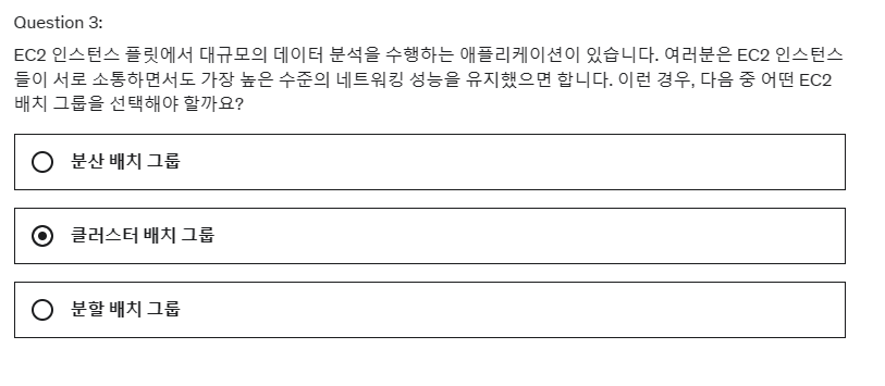 3. EC2 인스턴스 플릿에서 대규모의 데이터 분석을 수행하는 애플리케이션이 있습니다. 여러분은 EC2 인스턴스들이 서로 소통하면서도 가장 높은 수준의 네트워킹 성능을 유지했으면 합니다. 이런 경우, 다음 중 어떤 EC2 배치 그룹을 선택해야 할까요?
