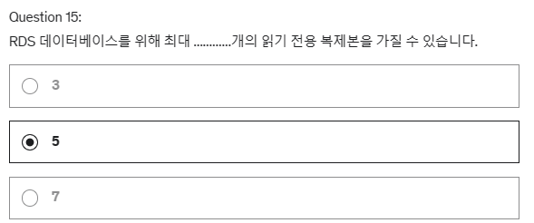 15. RDS 데이터베이스를 위해 최대 ............개의 읽기 전용 복제본을 가질 수 있습니다.