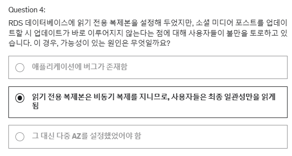 4. RDS 데이터베이스에 읽기 전용 복제본을 설정해 두었지만, 소셜 미디어 포스트를 업데이트할 시 업데이트가 바로 이루어지지 않는다는 점에 대해 사용자들이 불만을 토로하고 있습니다. 이 경우, 가능성이 있는 원인은 무엇일까요?