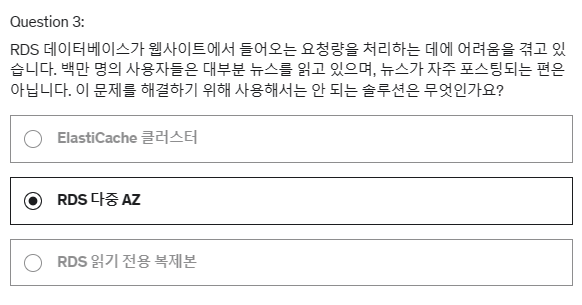 3. RDS 데이터베이스가 웹사이트에서 들어오는 요청량을 처리하는 데에 어려움을 겪고 있습니다. 백만 명의 사용자들은 대부분 뉴스를 읽고 있으며, 뉴스가 자주 포스팅되는 편은 아닙니다. 이 문제를 해결하기 위해 사용해서는 안 되는 솔루션은 무엇인가요?