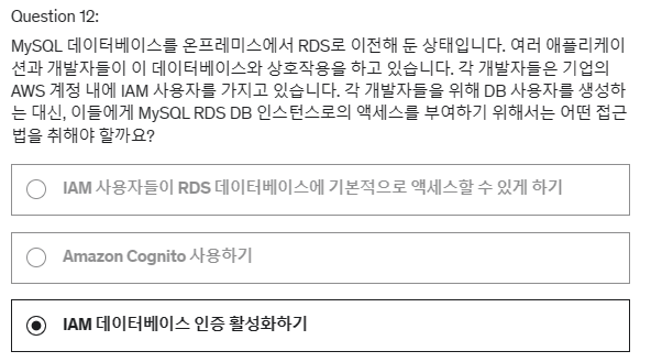12.MySQL 데이터베이스를 온프레미스에서 RDS로 이전해 둔 상태입니다. 여러 애플리케이션과 개발자들이 이 데이터베이스와 상호작용을 하고 있습니다. 각 개발자들은 기업의 AWS 계정 내에 IAM 사용자를 가지고 있습니다. 각 개발자들을 위해 DB 사용자를 생성하는 대신, 이들에게 MySQL RDS DB 인스턴스로의 액세스를 부여하기 위해서는 어떤 접근법을 취해야 할까요?