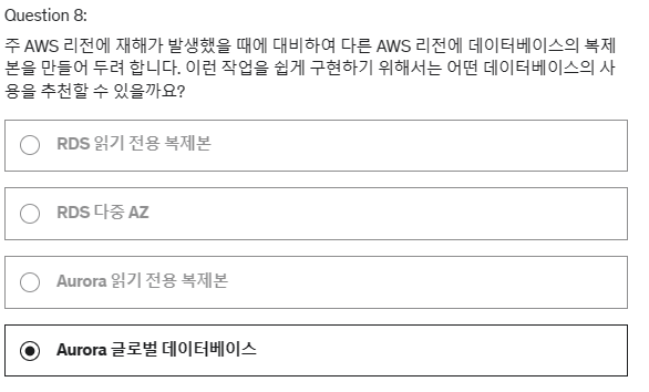 8. 주 AWS 리전에 재해가 발생했을 때에 대비하여 다른 AWS 리전에 데이터베이스의 복제본을 만들어 두려 합니다. 이런 작업을 쉽게 구현하기 위해서는 어떤 데이터베이스의 사용을 추천할 수 있을까요?
