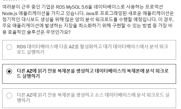11. 여러분이 근무 중인 기업은 RDS MySQL 5.6을 데이터베이스로 사용하는 프로덕션 Node.js 애플리케이션을 가지고 있습니다. Java로 프로그래밍된 새로운 애플리케이션은 정기적인 대시보드 생성을 위해 많은 양의 분석 워크로드를 수행할 예정입니다. 이 경우, 주요 애플리케이션에 발생하는 지장을 최소화하기 위해 구현할 수 있는 방법 중 가장 비용 효율적인 솔루션은 무엇인가요?