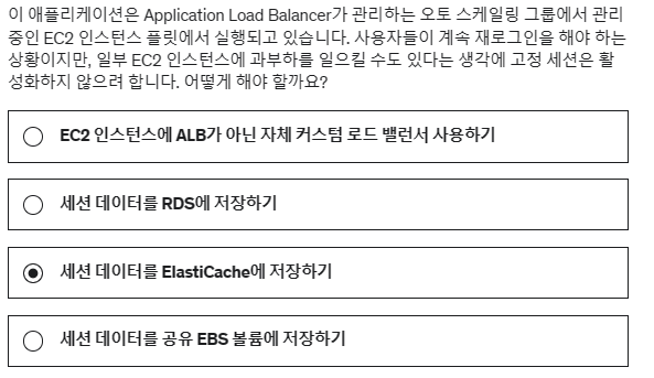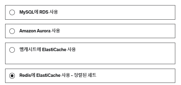시험 문제를 읽을 때는 주의하시기 바랍니다. 이 문제에서는, 이런 문제점을 해결하기 위해 사용해서는 "안 되는" 솔루션이 무엇인지 묻고 있습니다. ElastiCache와 RDS 읽기 전용 복제본은 읽기 스케일링에 도움이 됩니다.