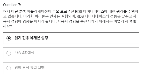 7. 현재 어떤 분석 애플리케이션이 주요 프로덕션 RDS 데이터베이스에 대한 쿼리를 수행하고 있습니다. 이러한 쿼리들은 언제든 실행되어, RDS 데이터베이스의 성능을 낮추고 사용자 경험에 영향을 미치게 됩니다. 사용자 경험을 증진시키기 위해서는 어떻게 해야 할까요?