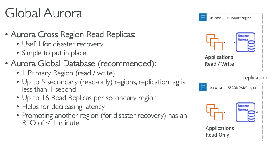 Aurora 글로벌 데이터베이스를 사용하면 최대 5개의 2차 리전까지 Aurora 복제본을 가질 수 있습니다.
