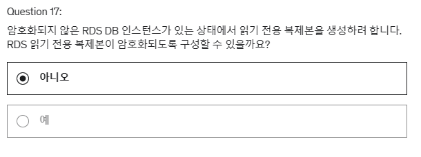 17. 암호화되지 않은 RDS DB 인스턴스가 있는 상태에서 읽기 전용 복제본을 생성하려 합니다. RDS 읽기 전용 복제본이 암호화되도록 구성할 수 있을까요?