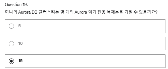 19. 하나의 Aurora DB 클러스터는 몇 개의 Aurora 읽기 전용 복제본을 가질 수 있을까요?