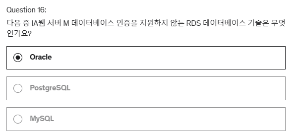16.다음 중 IA웹 서버 M 데이터베이스 인증을 지원하지 않는 RDS 데이터베이스 기술은 무엇인가요?