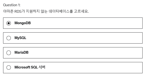 1. 아마존 RDS가 지원하지 않는 데이터베이스를 고르세요.