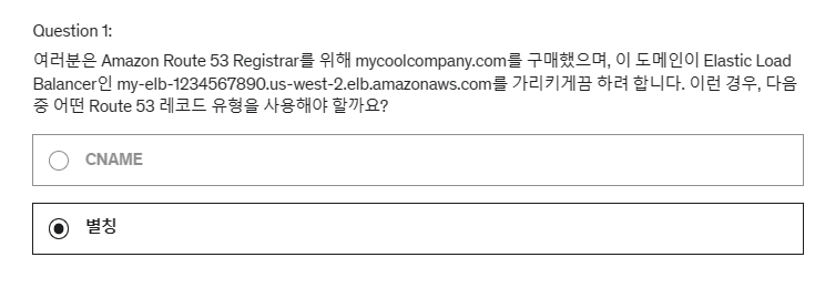 1. 여러분은 Amazon Route 53 Registrar를 위해 mycoolcompany.com를 구매했으며, 이 도메인이 Elastic Load Balancer인 my-elb-1234567890.us-west-2.elb.amazonaws.com를 가리키게끔 하려 합니다. 이런 경우, 다음 중 어떤 Route 53 레코드 유형을 사용해야 할까요?