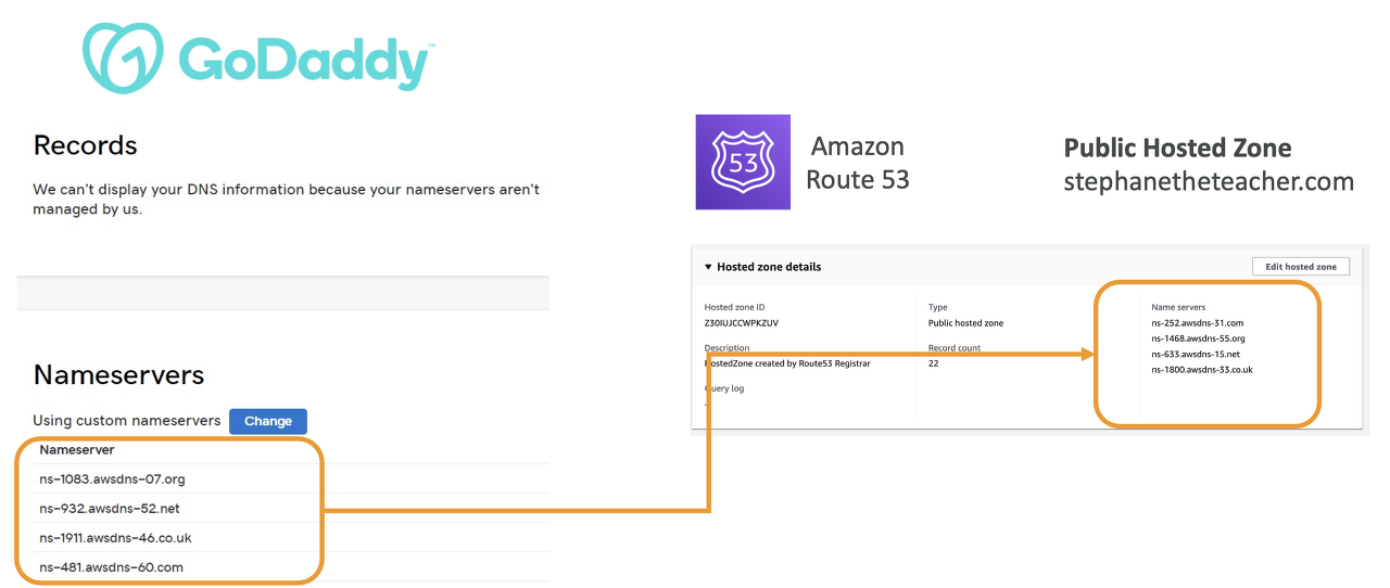 godaddy에서 사용하는 네임서버에 관한 쿼리에 응답하면 네임서버가 route 53의 네임서버를 가리키게 된다.
