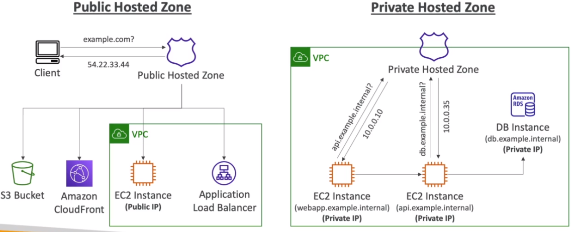 프라이빗 호스팅 존은 프라이빗 IP 를 알려준다. VPC 에서만 작동한다 .