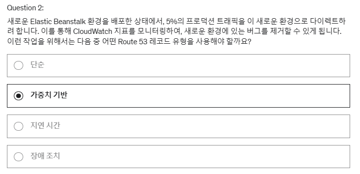 2.새로운 Elastic Beanstalk 환경을 배포한 상태에서, 5%의 프로덕션 트래픽을 이 새로운 환경으로 다이렉트하려 합니다. 이를 통해 CloudWatch 지표를 모니터링하여, 새로운 환경에 있는 버그를 제거할 수 있게 됩니다. 이런 작업을 위해서는 다음 중 어떤 Route 53 레코드 유형을 사용해야 할까요?