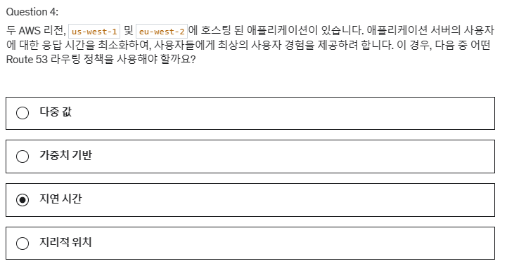 4. 두 AWS 리전, us-west-1 및 eu-west-2에 호스팅 된 애플리케이션이 있습니다. 애플리케이션 서버의 사용자에 대한 응답 시간을 최소화하여, 사용자들에게 최상의 사용자 경험을 제공하려 합니다. 이 경우, 다음 중 어떤 Route 53 라우팅 정책을 사용해야 할까요?