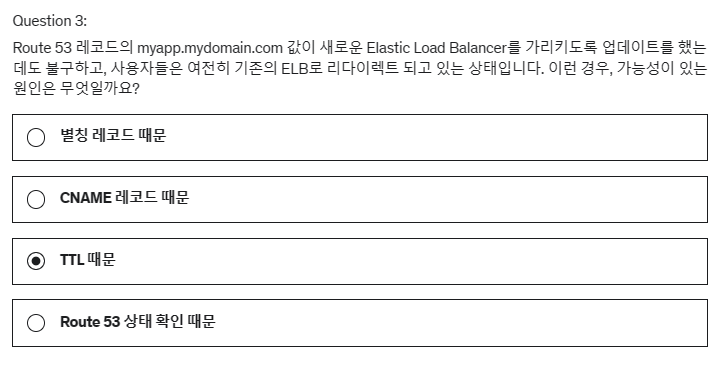 3. Route 53 레코드의 myapp.mydomain.com 값이 새로운 Elastic Load Balancer를 가리키도록 업데이트를 했는데도 불구하고, 사용자들은 여전히 기존의 ELB로 리다이렉트 되고 있는 상태입니다. 이런 경우, 가능성이 있는 원인은 무엇일까요?