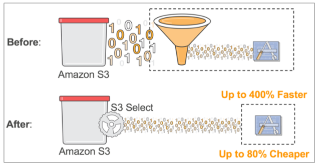 S3 Select 를 사용하면 s3 가 대신 파일을 필터링 해 주고 필요한 데이터만 검색할 수 있다.