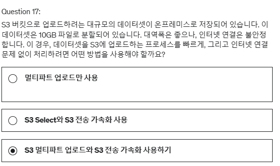 17. S3 버킷으로 업로드하려는 대규모의 데이터셋이 온프레미스로 저장되어 있습니다. 이 데이터셋은 10GB 파일로 분할되어 있습니다. 대역폭은 좋으나, 인터넷 연결은 불안정합니다. 이 경우, 데이터셋을 S3에 업로드하는 프로세스를 빠르게, 그리고 인터넷 연결 문제 없이 처리하려면 어떤 방법을 사용해야 할까요?