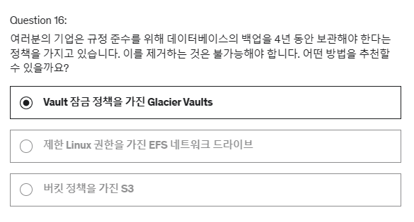 16. 여러분의 기업은 규정 준수를 위해 데이터베이스의 백업을 4년 동안 보관해야 한다는 정책을 가지고 있습니다. 이를 제거하는 것은 불가능해야 합니다. 어떤 방법을 추천할 수 있을까요?