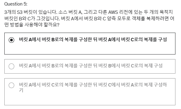 5. 3개의 S3 버킷이 있습니다. 소스 버킷 A, 그리고 다른 AWS 리전에 있는 두 개의 목적지 버킷인 B와 C가 그것입니다. 버킷 A에서 버킷 B와 C 양측 모두로 객체를 복제하려면 어떤 방법을 사용해야 할까요?