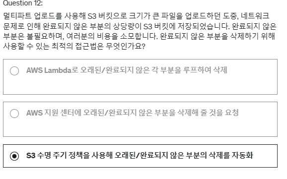 12. 멀티파트 업로드를 사용해 S3 버킷으로 크기가 큰 파일을 업로드하던 도중, 네트워크 문제로 인해 완료되지 않은 부분의 상당량이 S3 버킷에 저장되었습니다. 완료되지 않은 부분은 불필요하며, 여러분의 비용을 소모합니다. 완료되지 않은 부분을 삭제하기 위해 사용할 수 있는 최적의 접근법은 무엇인가요?