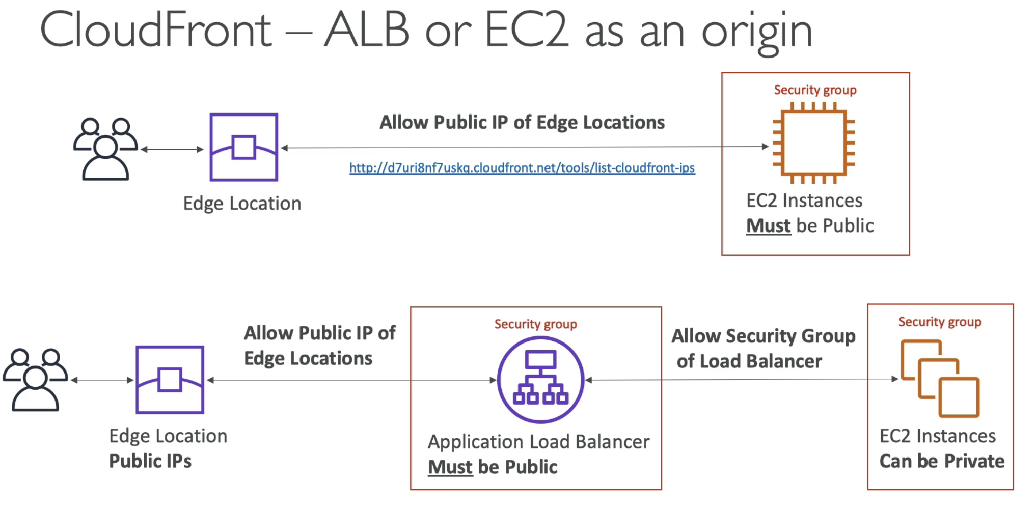 보안 그룹이 엣지 로케이션의 모든 공용 IP 에 클라우드 프론트가 EC2 인스턴스로부터 컨텐츠를 가져갈 수 있게끔 허용해야한다.