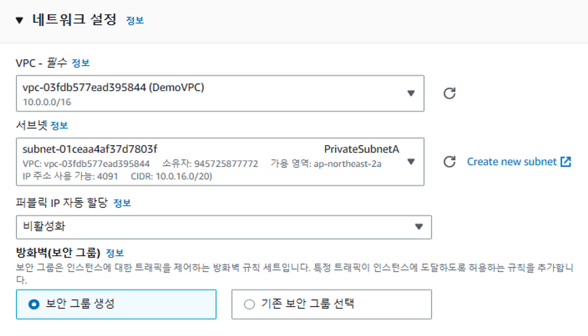 DemoVPC 선택하고 서브넷 생성하기