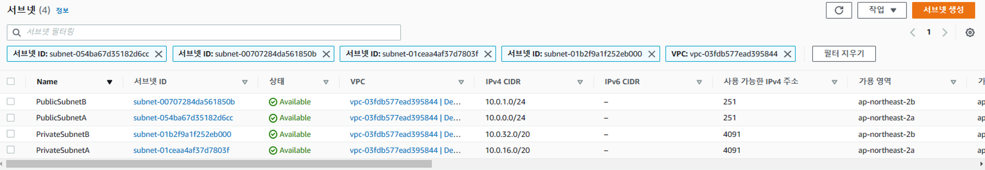 해당 VPC 와 연결되어있는 서브넷이다.