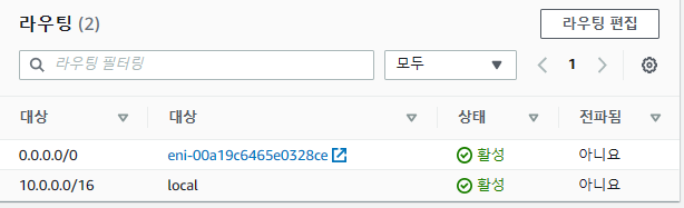 - 라우팅 테이블에 사설 서브넷이 NAT 인스턴스로 연결되도록 구성해야한다.